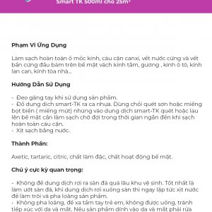 - Chất tẩy cặn canxi trên kính Smart TK giúp làm sạch triệt để 100% ngay từ lần đầu tiên